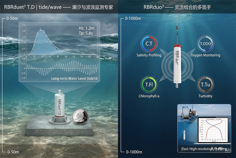 RBRduet³ 和 RBRduo³ 是RBR公司推出的两款双参数水下记录仪,旨在为用户提供比单通道仪器更丰富的数据维度,同时保持设计的精简与高效。RBRduet³ 系列为预配置的紧凑型仪器,经典型号 T.D 集成了温度和压力传感器,是潮汐、波浪监测的高性价比之选。RBRduo³ 系列则具备高度的灵活性,允许用户从十几种传感器中任选两种进行自由组合,实现从基础的温盐测量到复杂的水质参数组合测量。两款产品均秉承长续航、大容量、坚固耐用的设计理念,是锚系、走航和剖面测量的理想双参数解决方案。