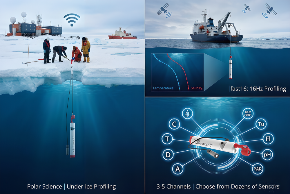 可从十余种传感器中任选3-5种进行组合,包括电导率(C)、温度(T)、压力(D)、溶解氧(DO/ODO)、浊度(Tu)、PAR、pH等,真正实现定制化测量。